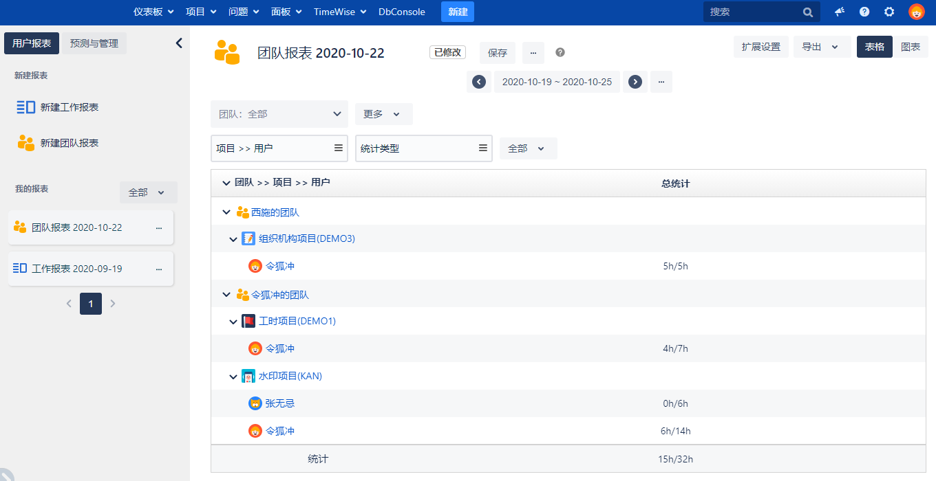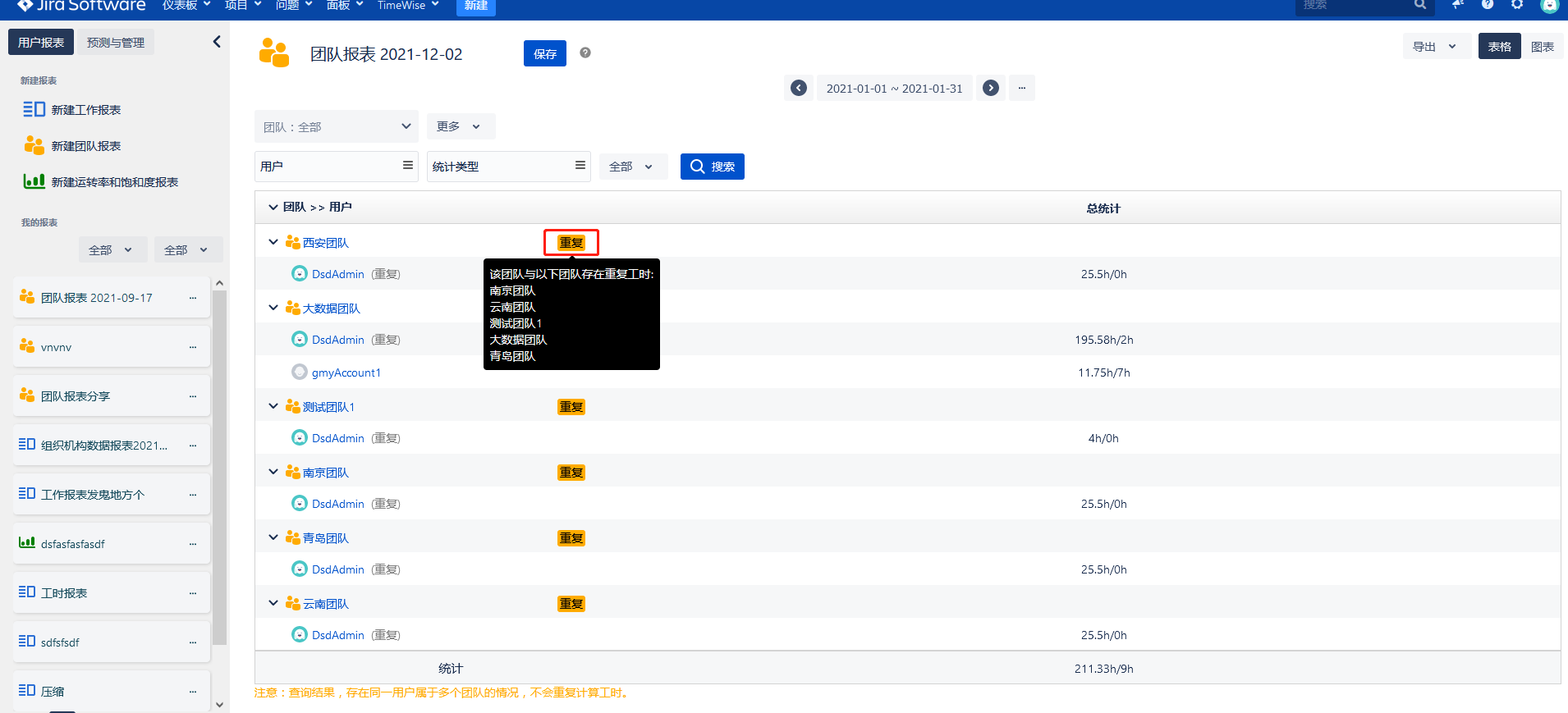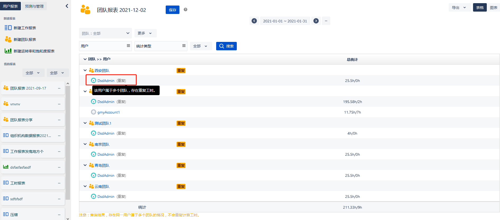 - 查询团队报表时,若团队之间存在相同的工时,则会在团队后边显示重复标签,鼠标上浮,会显示有哪些团队与当前团队存在重复工时