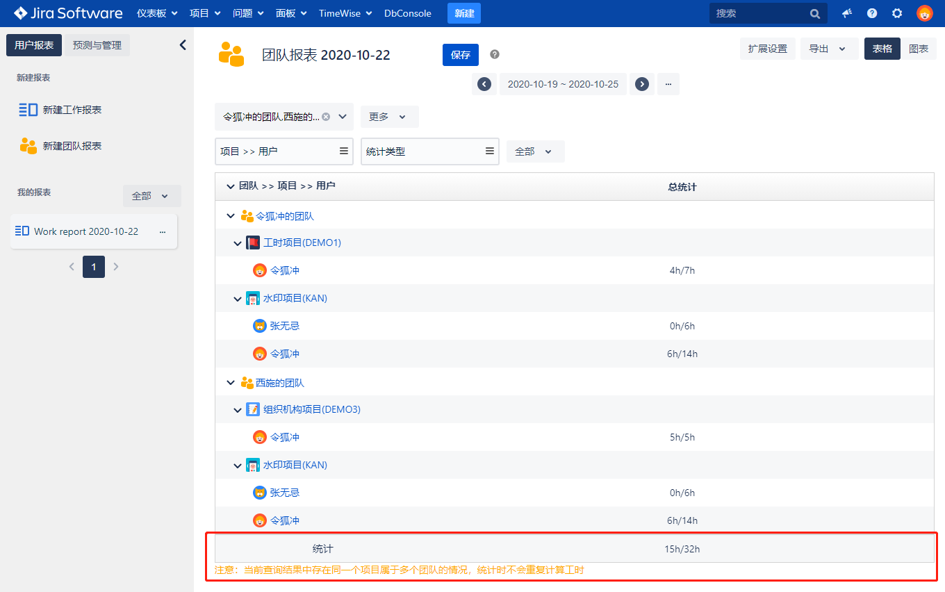- 具体是哪个用户属于多个团队,在用户名后边会有显示,鼠标上浮,会提示”该用户属于多个团队,存在重复工时“