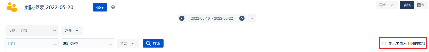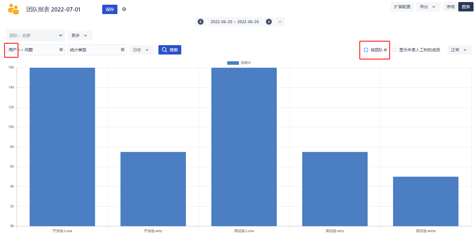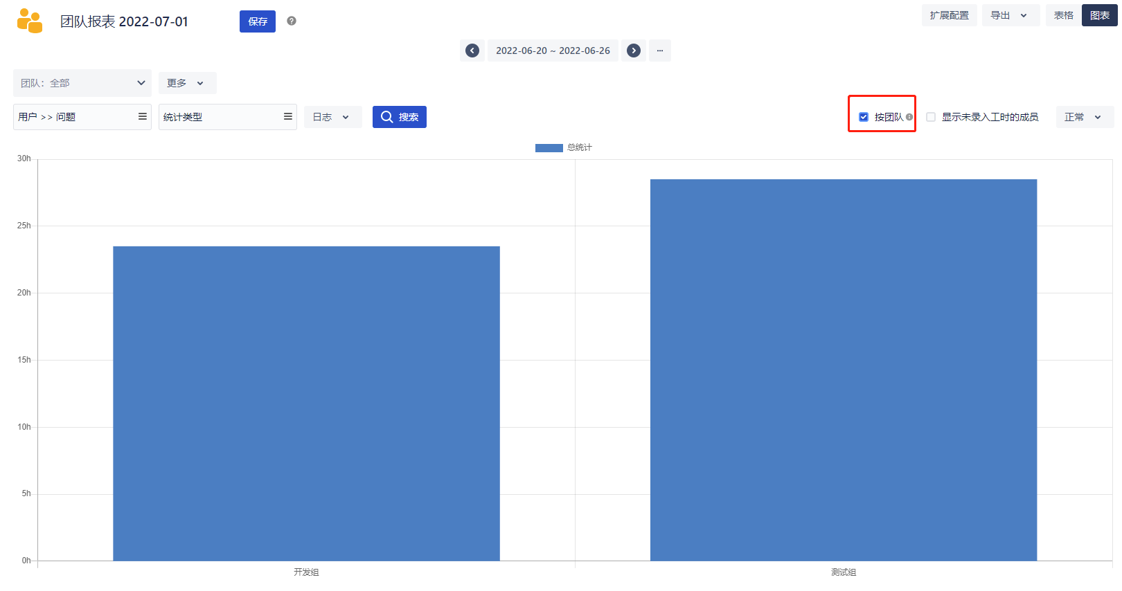 • 选中“按团队”,按照团队维度查看每个团队的工时柱状图;