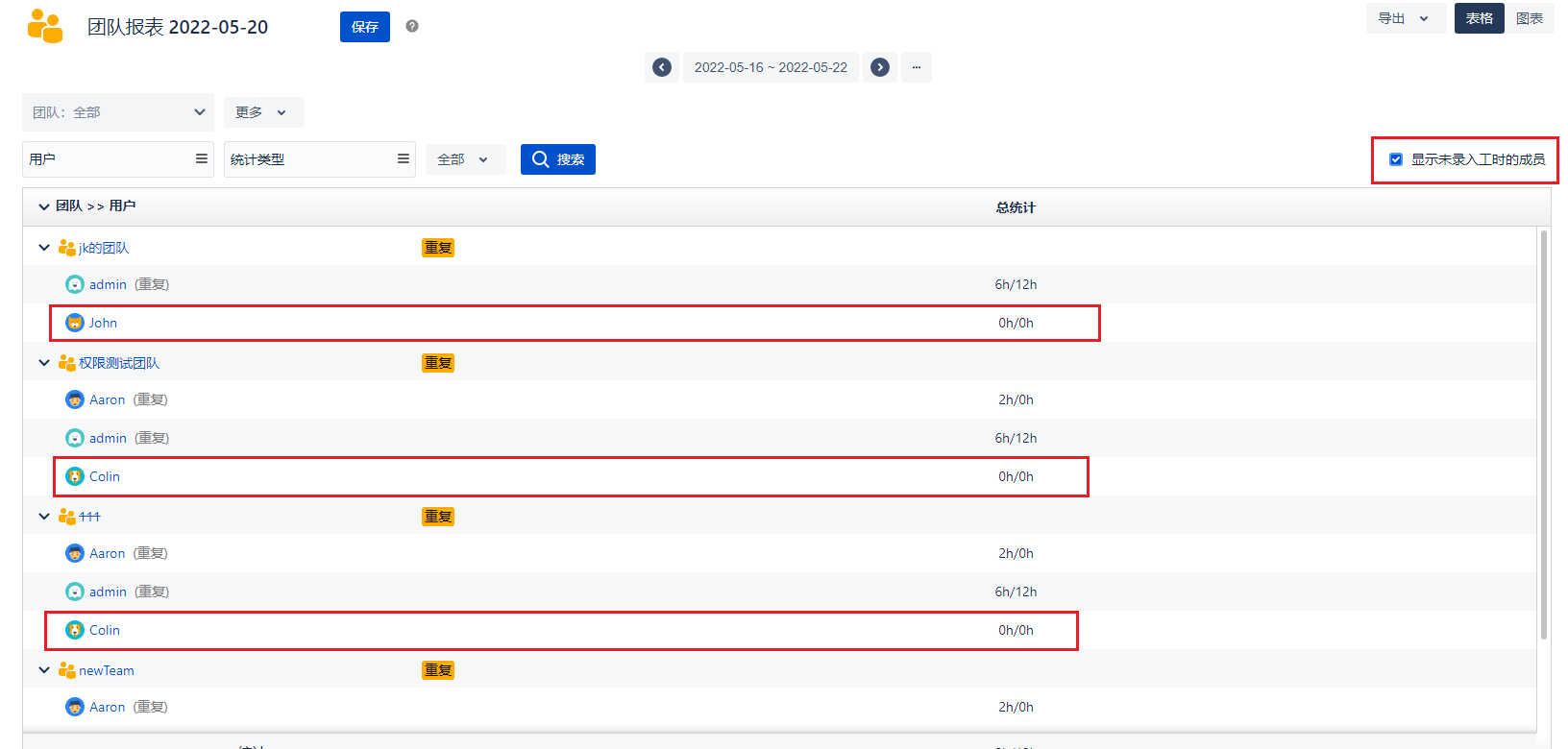 • 查询团队报表时,若团队之间存在相同的工时,则会在团队后边显示重复标签,鼠标上浮,会显示有哪些团队与当前团队存在重复工时