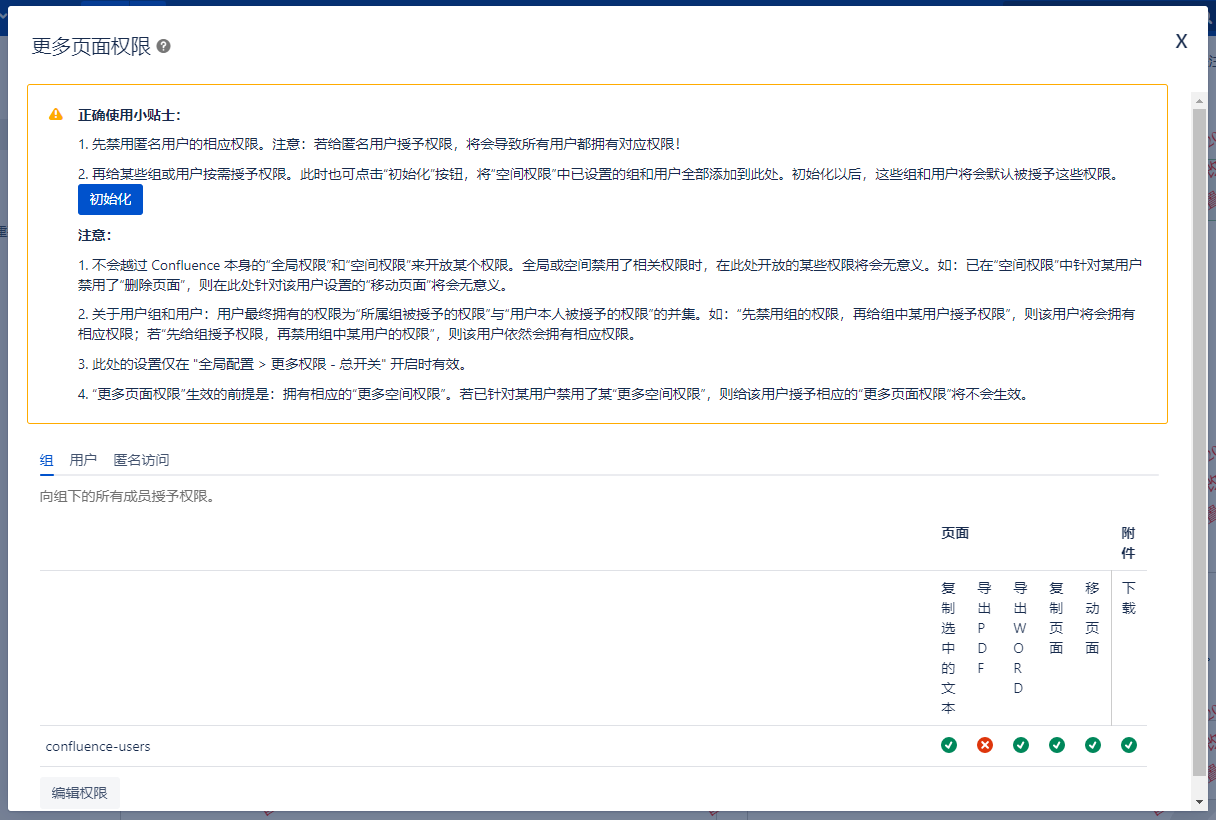 可分别对 "组"、"用户"、"匿名访问" 设置以下更多页面权限: