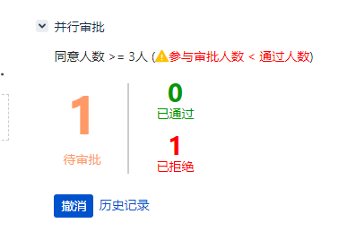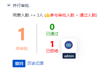 ③ 当审批规则异常时(设置的通过人数需>参与审批的总人数),当所有用户审批结束,则停留在此状态,不做处理;