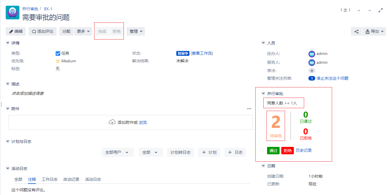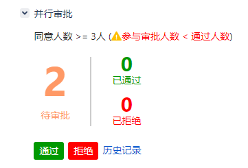 例如:通过人数需 >= 1, 审批人数为两个,所以,当其中一人审批通过即为通过;
