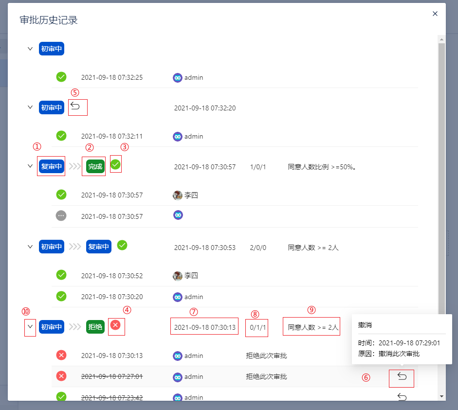 ⑥ 此条审批结果被撤消的标识,鼠标悬浮展示撤消时间和原因