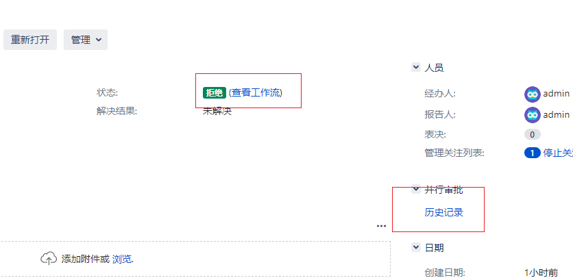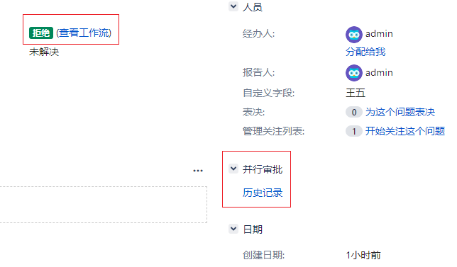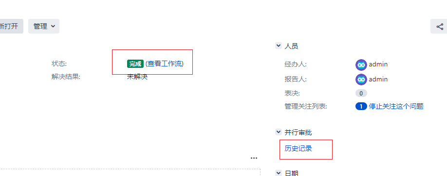每个审批人在审批后都会产生一条审批记录,点击历史记录,可以查看此条Issue下所有状态的审批记录: