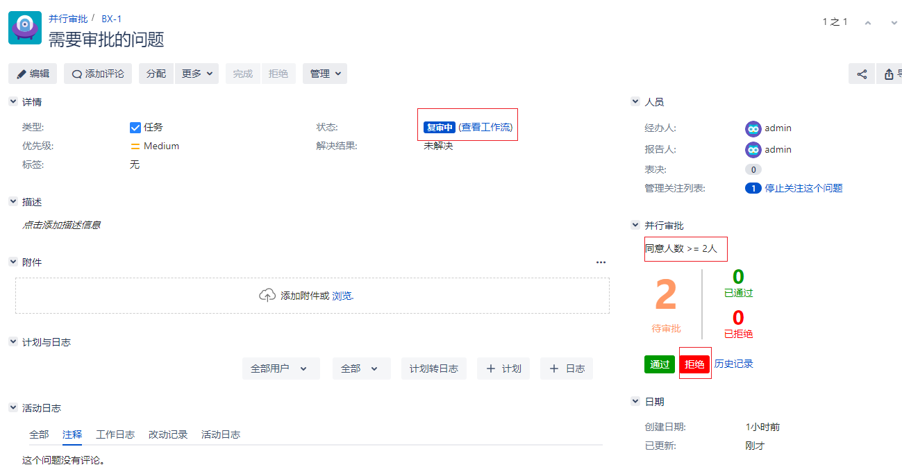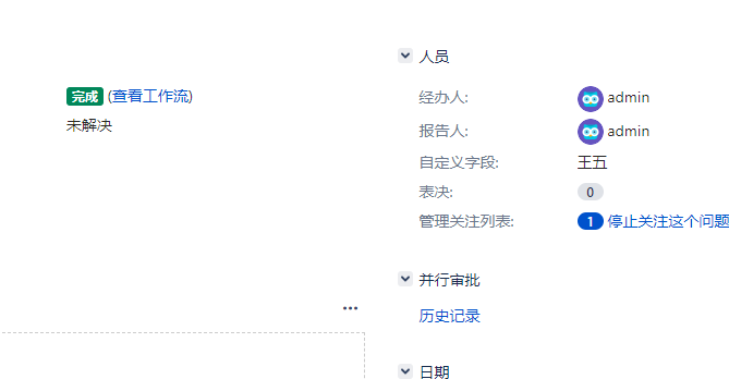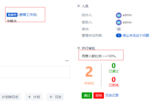 注意:当审批规则异常时(例如:审批通过人数大于实际审批人数时),当现有审批人全部审批结束后,此issue的状态会停留在当前状态,并不会自动进入下一个状态,需要拥有管理员权限的用户,去后台修改审批通过规则,或者添加审批人。