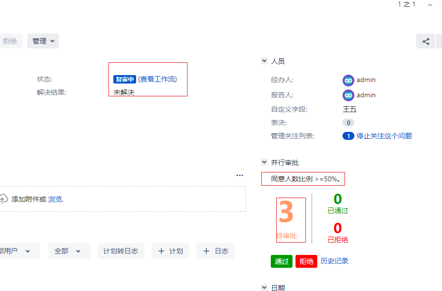 例如:当待审批人数为2人,设定的通过规则为100%,所以当所有用户都执行了通过操作,则通过人数的比例为100%>=设定值100%,所以,直接执行通过后的操作,反之亦然。
