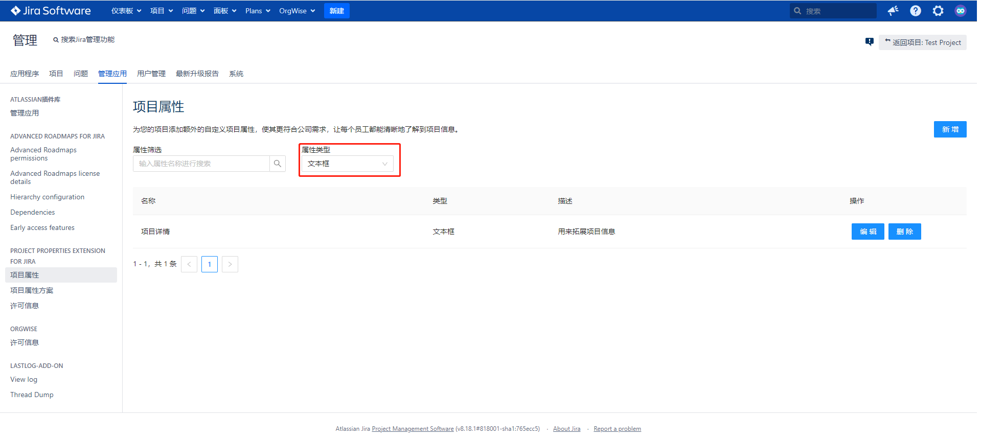 1 点击”管理应用“,进入到”管理应用“主页面,看到PROJECT PROPERTIES EXTENSION FOR JIRA,点击下方的”项目属性“,显示项目属性主页面,分页展示,一页展示10条数据: