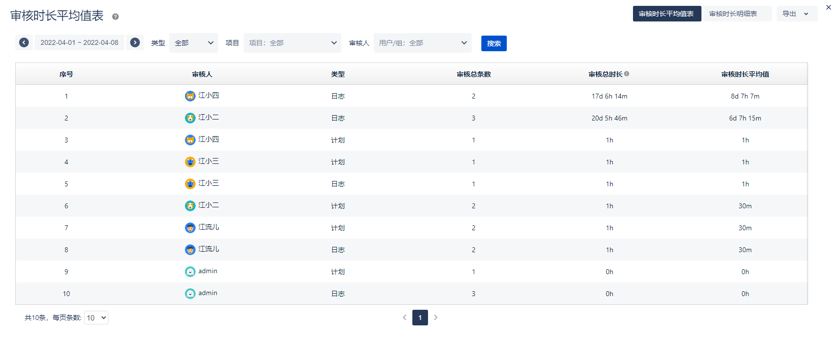 用户可以查询一段时间区间内,已审核的日志或计划总数量,及审核花费的总时长,审核一条数据花费的平均时长