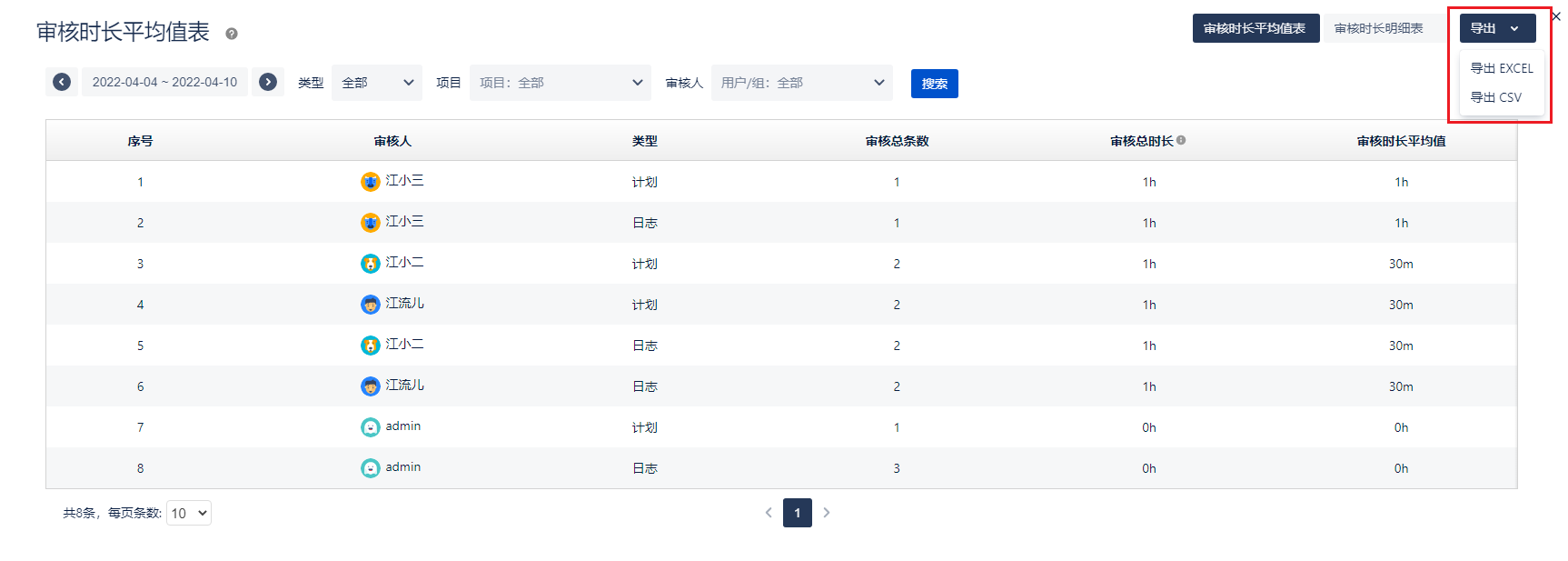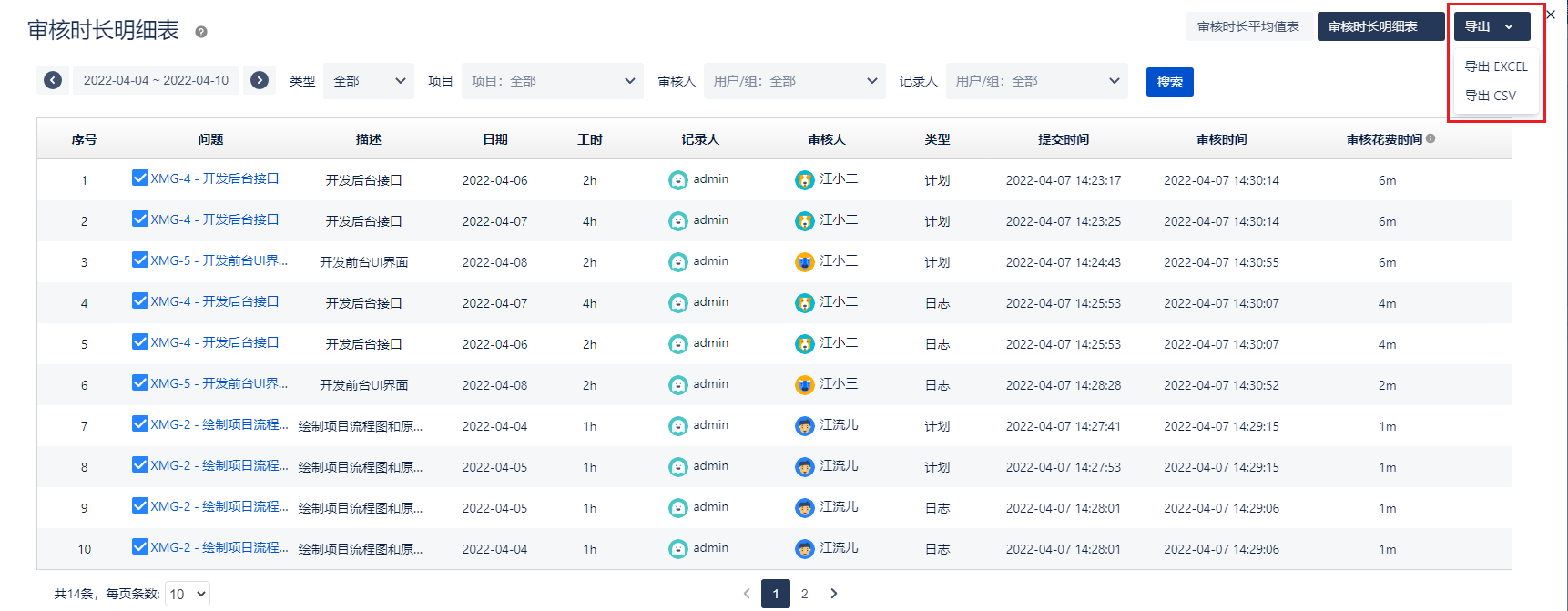 审核时长平均值表 和 审核时长明细表 查询记录可以导出Excel 或 Csv
