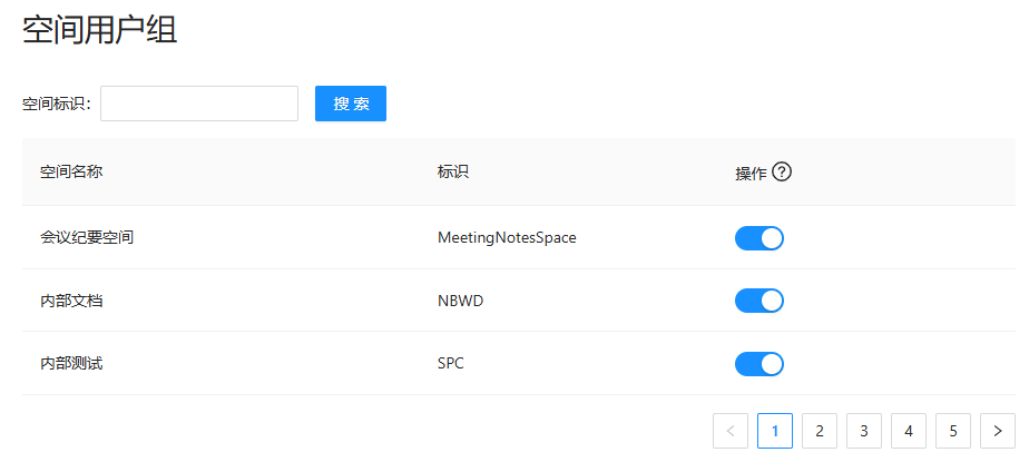点击空间信息列表对象的开关按钮,可控制空间管理员使用”空间用户组“功能的权限。