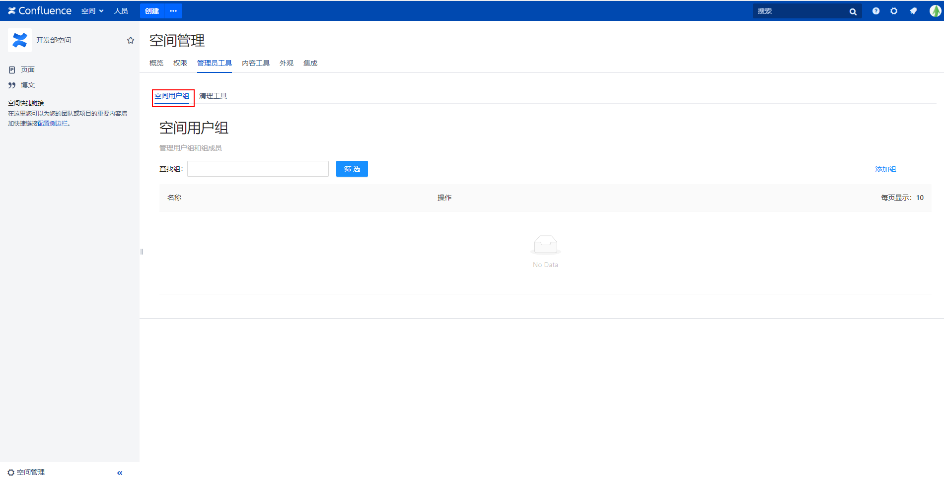 作用示例:如果此空间的工具权限是开启状态,那么进入空间管理→ Admin Toolkit后,便可以看到“空间用户组”的页面,如下图所示: