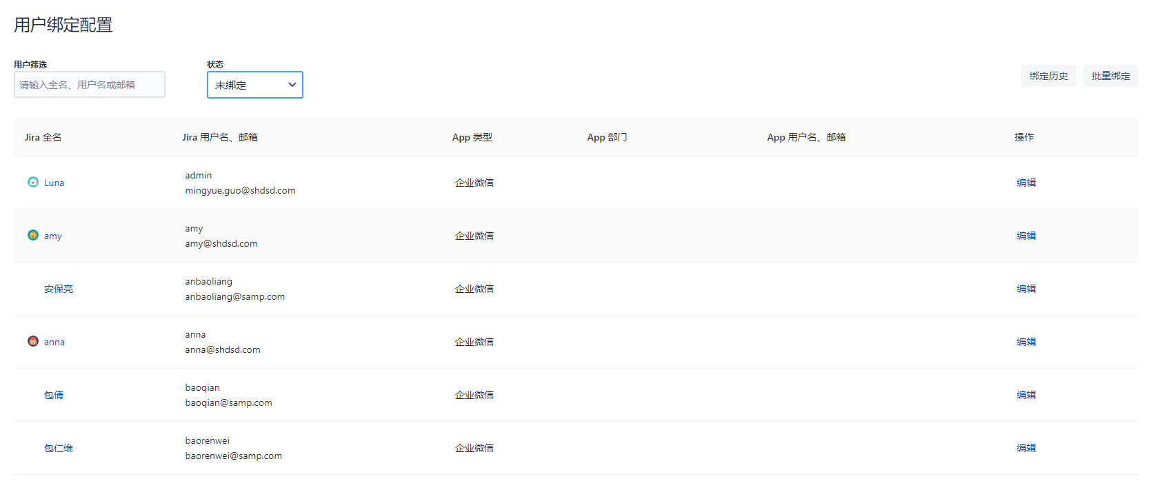 通过 WeChat Work for Jira 插件-用户绑定配置,进入页面,状态选择”未绑定“,点击Jira用户对应的”编辑“按钮,进行绑定操作。