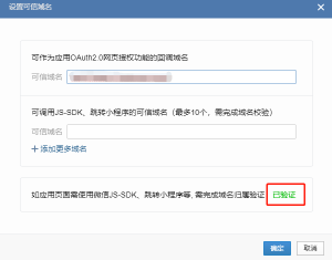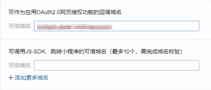 3.1.创建自建应用后,点击自建应用页面中的【开发者接口】-【网页授权及 JS-SDK】,点击设置可信域名。可信域名:域名填写申请的域名。