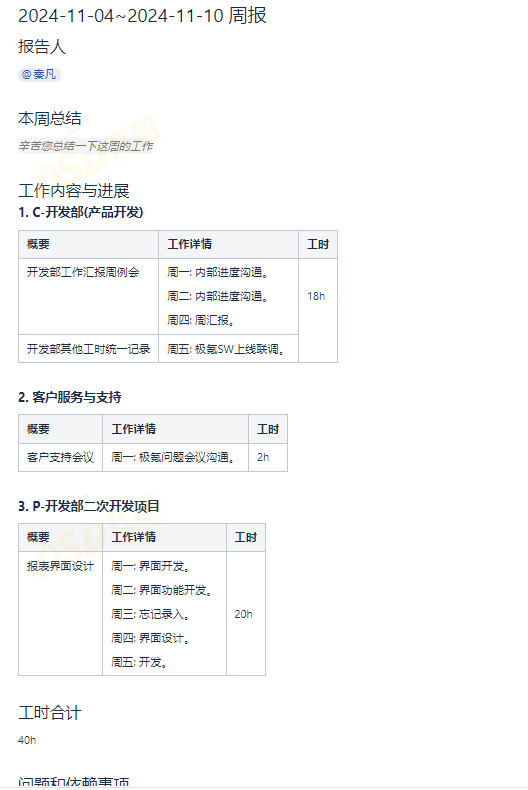 ”个人周报“蓝图创建的页面由 ”报告人“、”本周总结“、”工作内容与进展“、”工时花费“、”存在的问题“、”下周计划“ 6个部分组成。