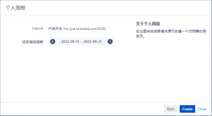 引导界面中,用户只需要选择Jira数据源(JiraLink) 和报告周期即可,如果当前的Confluence环境只存在一个Jira数据源则无需选择,仅选择报告周期即可,最后点击创建按钮。