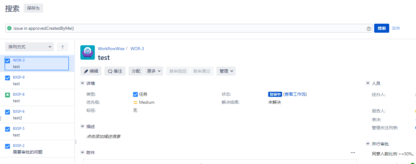 | issue in approvedCreatedByMe() | 查询由我创建的,且正在审批流程中的 issue |