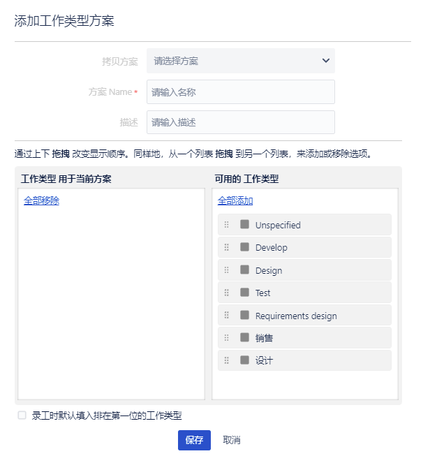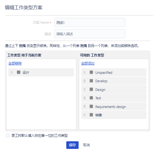 方案名称可以修改但不能为空,描述可以为空,将【可用的 工作类型】拖拽到【工作类型 用于当前方案】中,选择录入工时是否默认填入排在第一位的工作类型,点击“保存”。