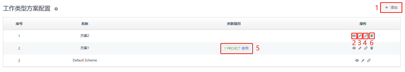 1. 点击【删除】按钮,默认工作类型方案不能被删除。如下图:序号1