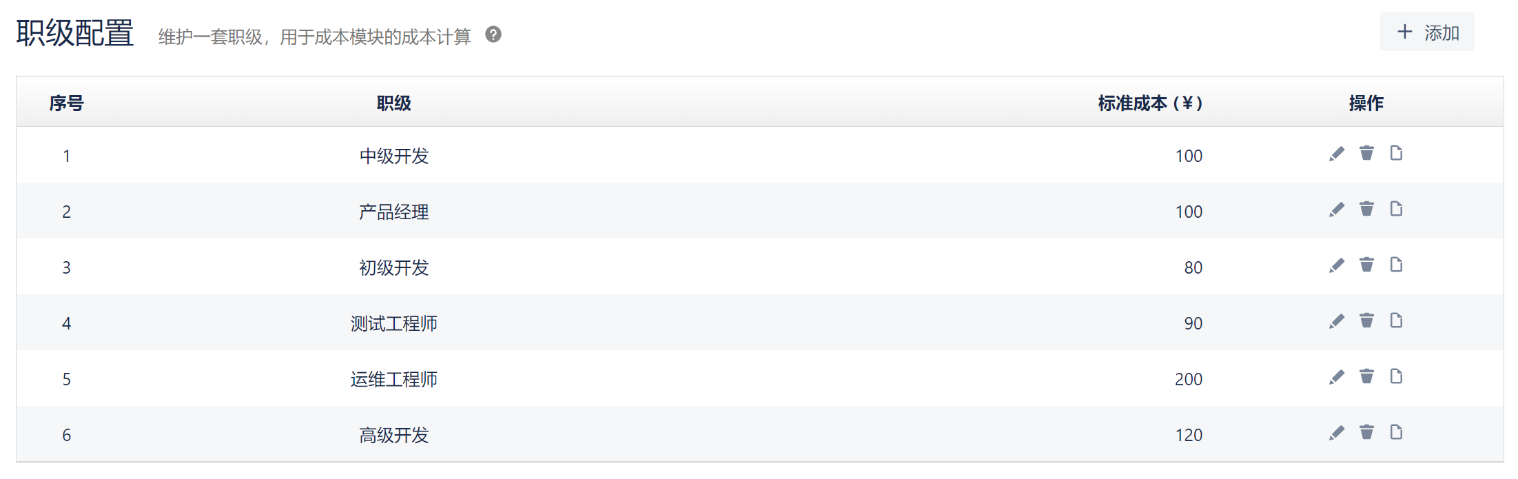某一级别的某一职位,如中级java开发工程师。不同的职级的标准成本不同,标准成本用于成本统计。