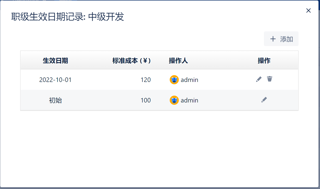 标准成本可能随着时间推移发生变化,标准成本与生效日期的对应关系会在下图所示表中展示,您可以在此维护该职级的标准成本变化。