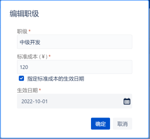 可以修改职级名称和标准成本。由于标准成本可能随着时间推移发生变化,当初始标准成本不再适用、发生改变时,可在编辑时指定标准成本在未来某一天生效,这样不会影响之前的标准成本。