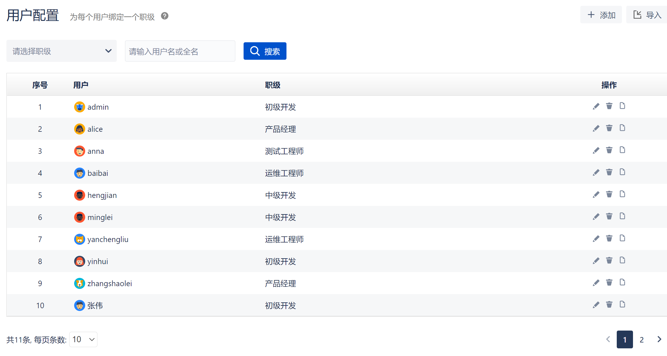 用户配置界面如下图所示,此页面显示已绑定过职级的用户,未绑定的用户需要通过“添加用户”或“导入用户”进行绑定。