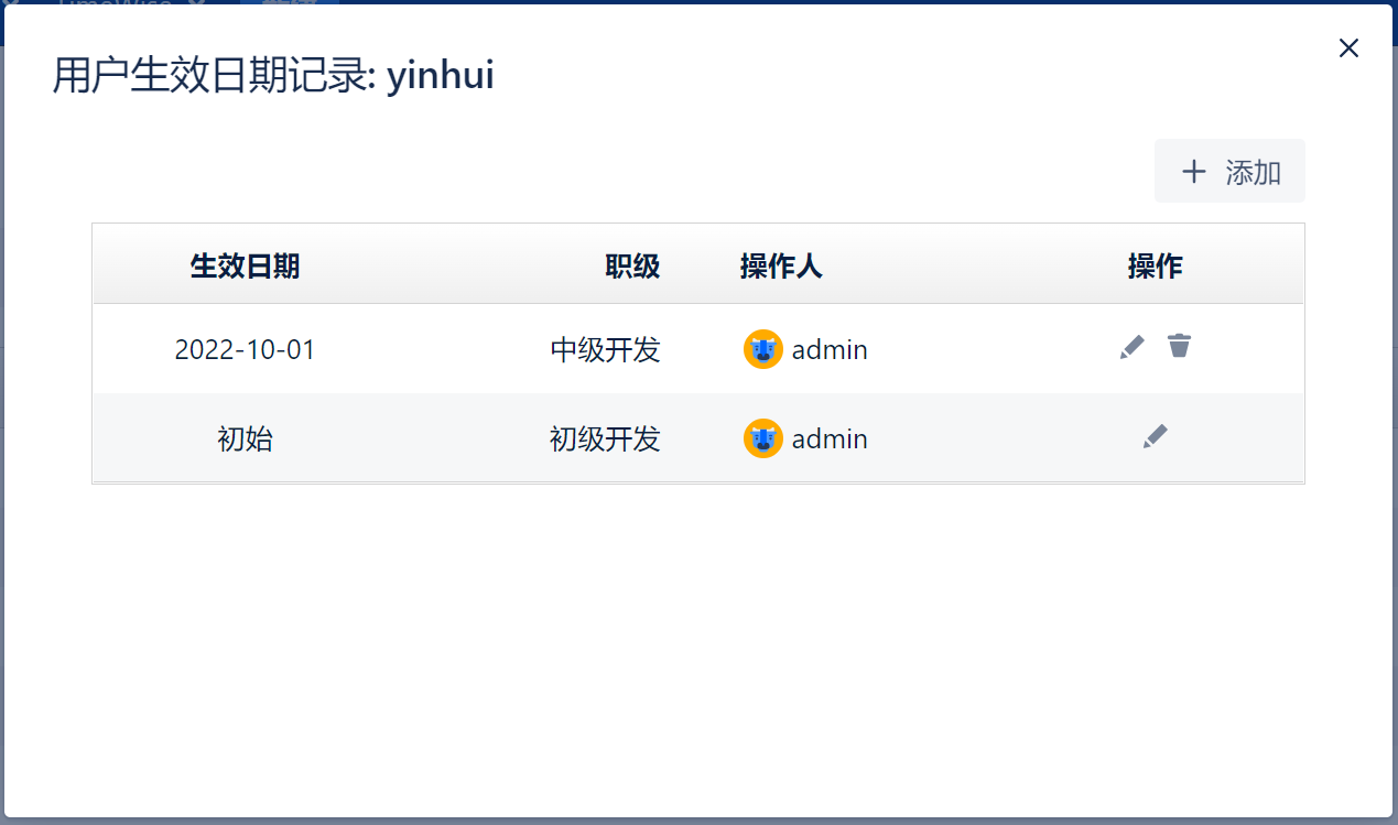 用户的职级可能随着时间推移发生变化,职级与生效日期的对应关系会在下图所示表中展示,您可以在此维护该用户的职级变化。