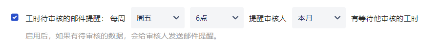启用后,会在设置的提醒时间,发送邮件给审核人,提醒他 上月 本月 上月和本月有等待他审核的工时: