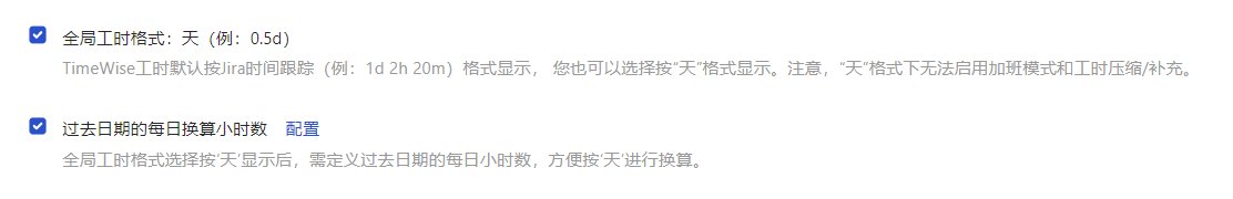 由于切换为“天”格式,会涉及到过去日期“1天=多少小时”的换算,默认按照Jira时间跟踪每日工作小时数,您也可以在此配置特殊的换算小时数。