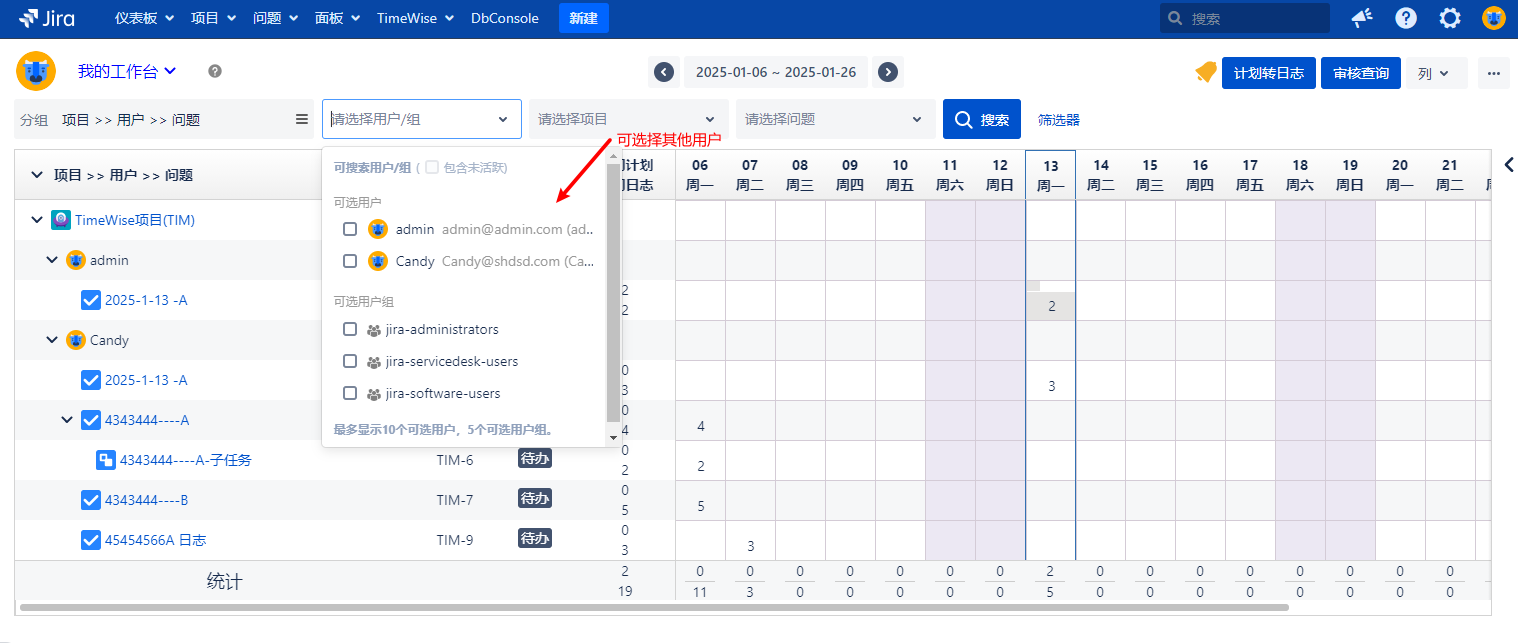 • 拥有 TimeWise 项目为他人录日志、查看他人日志权限的用户