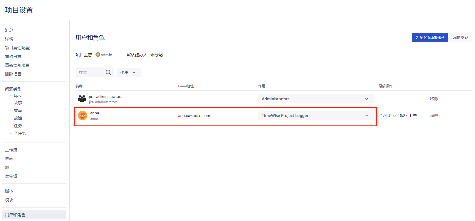 在“项目设置” > "为角色添加用户"中, 给用户/用户组授予项目角色 TimeWise Project Logger ,相应的用户/用户组即拥有了 TimeWise 项目为他人录日志、查看他人日志权限