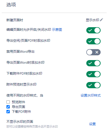 可自定义水印显示的页面、导出空间/页面时是否显示水印、PDF附件下载时是否显示水印等。