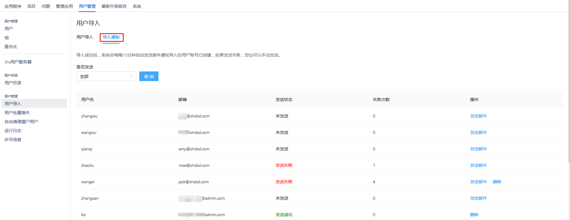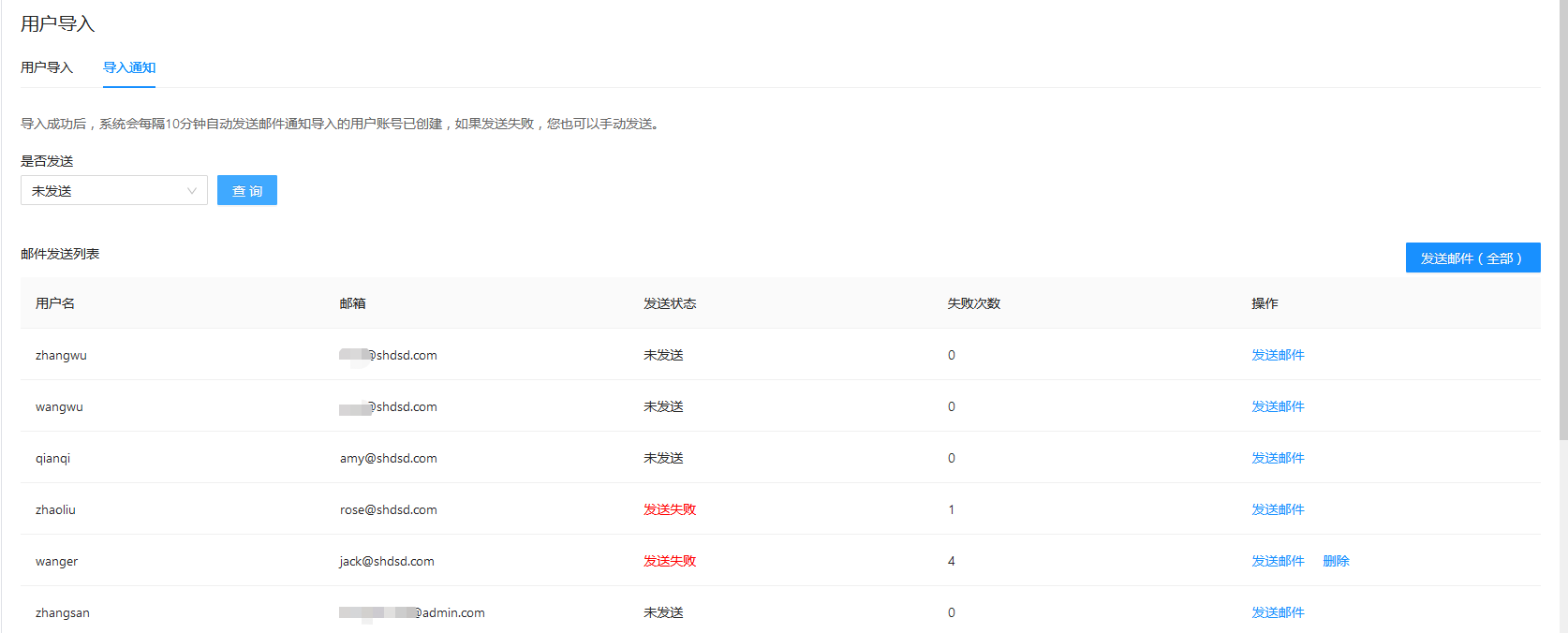 如果还未发送或发送失败,您也可以在”导入通知“中手动发送邮件: