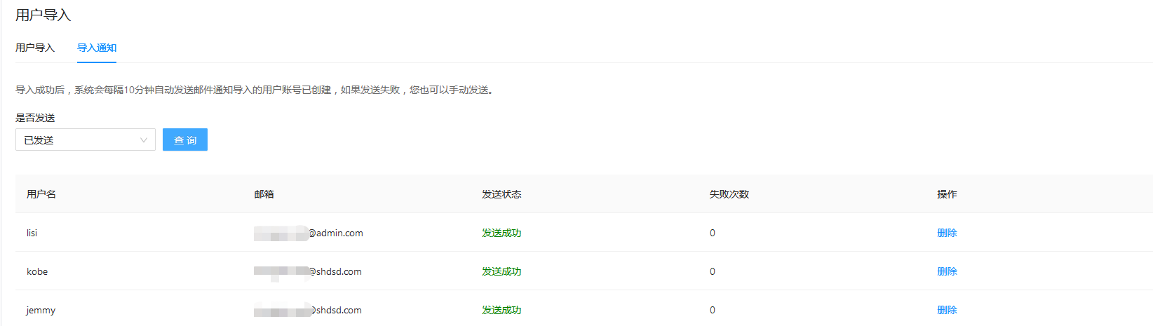 对导入成功的用户,系统会每隔10分钟定时发送邮件通知用户。