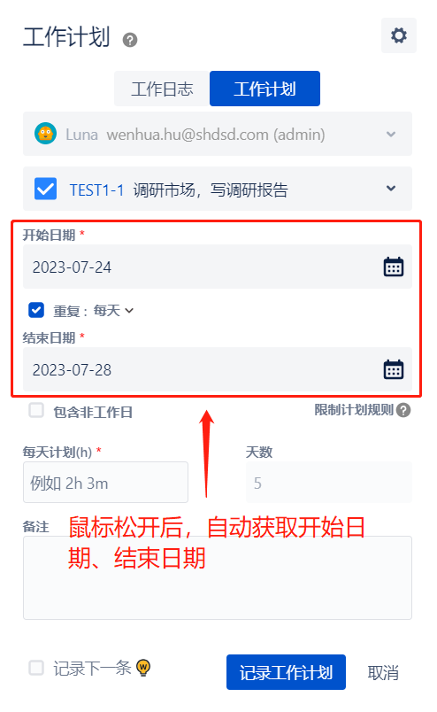 3.1 鼠标点击不放,滑动选择需要的工时计划时间范围,当鼠标松开后,系统会自动获取选中时间范围的开始日期和结束日期,每天重复。