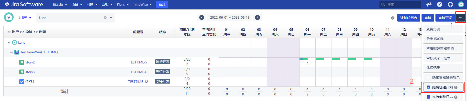 初次进入,拖拽创建计划功能是关闭的,点击右上角的(····),显示下拉列表信息,点击 “拖拽创建计划” 按钮,打开拖拽创建计划功能