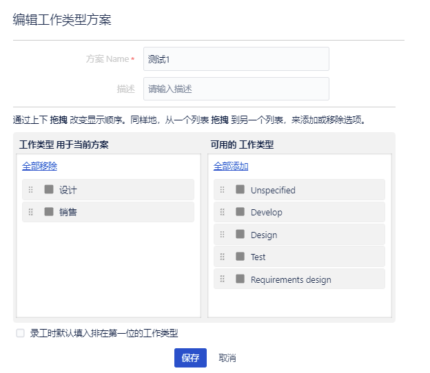 (3) 选择【可用的工作类型】到【工作类型 用于当前方案】中,一条方案可选多个日志类型。
