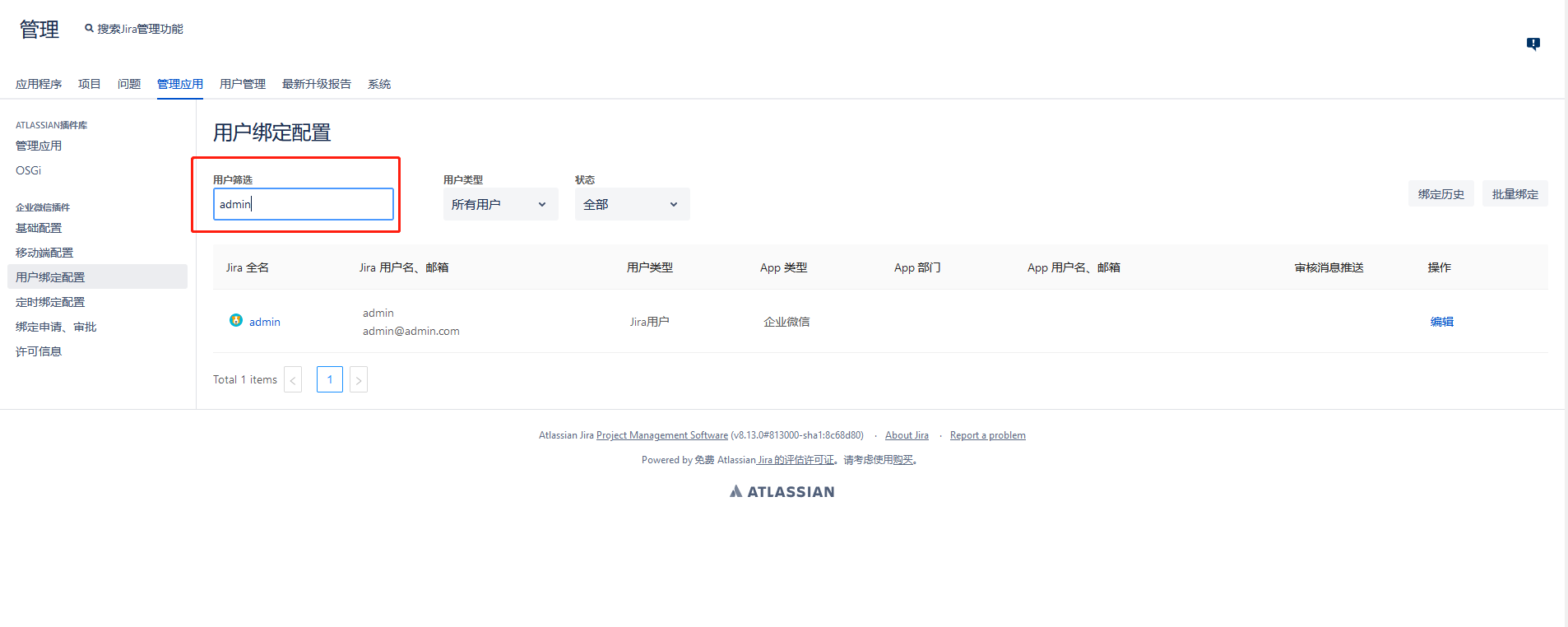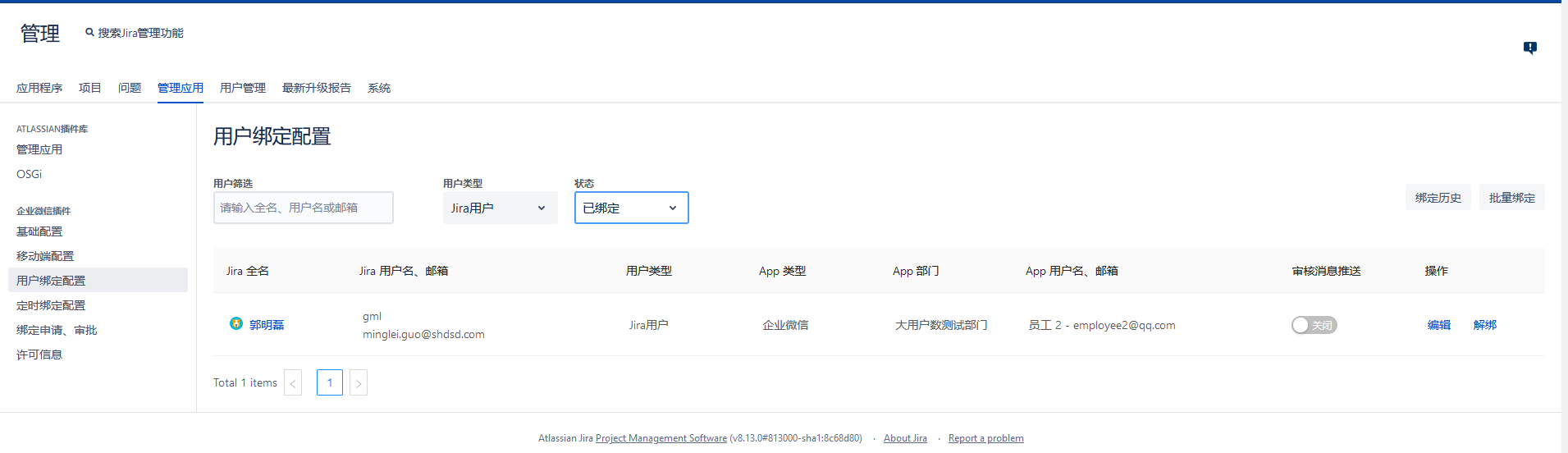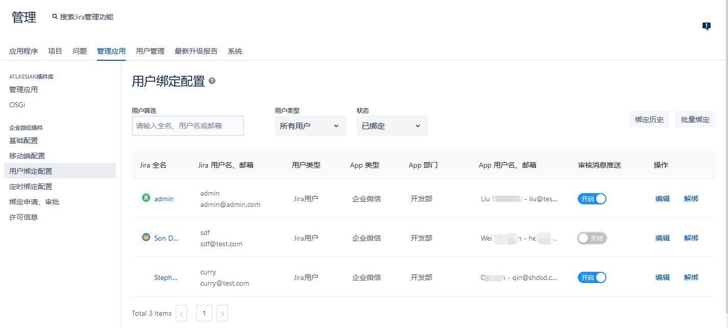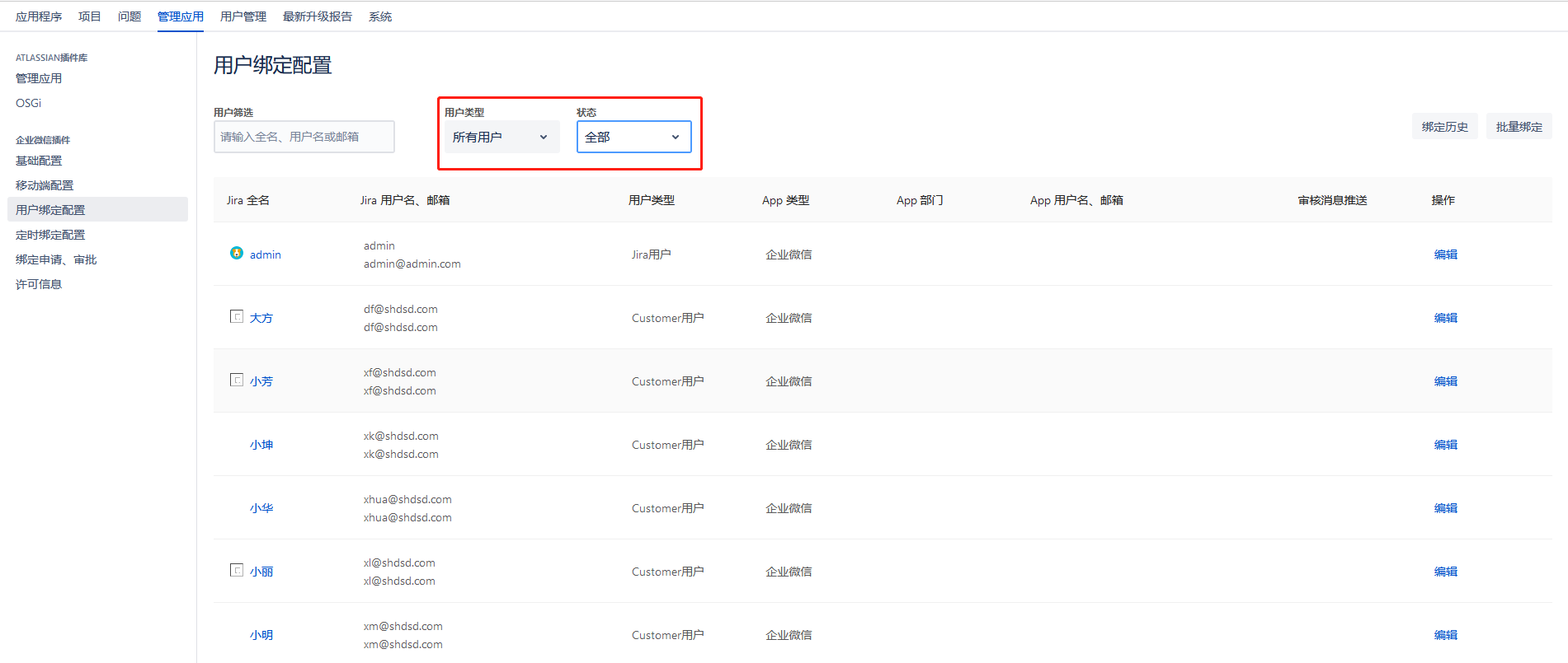 用户绑定配置:该功能主要 Jira 用户和企业微信绑定关系的管理,使用者可对状态和用户类型进行查询,对绑定的用户进行编辑,解绑等操作。除此之外,还有绑定历史的查询功能,以及批量绑定的功能等。