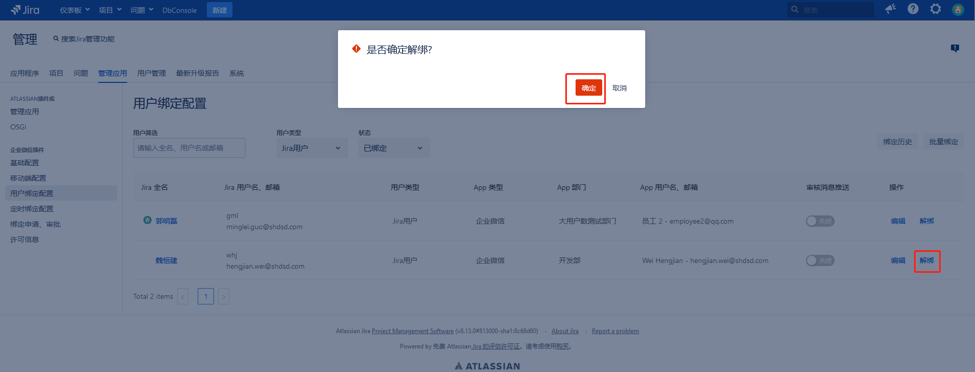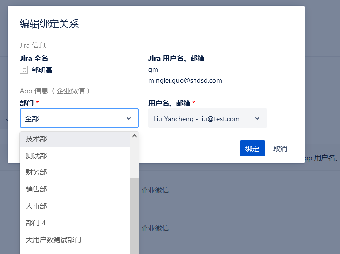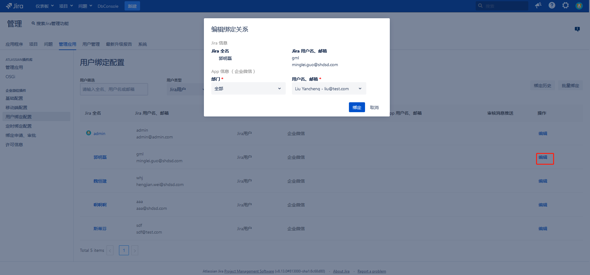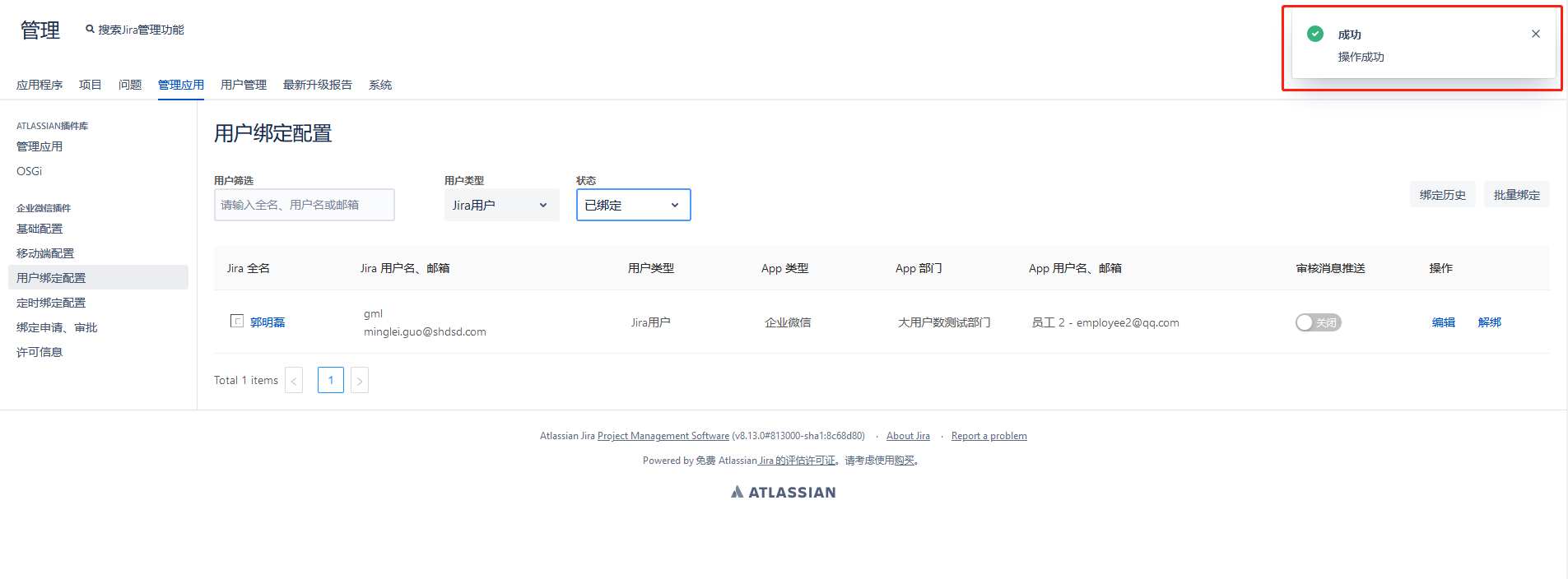 用户绑定配置:该功能主要 Jira 用户和企业微信绑定关系的管理,使用者可对状态和用户类型进行查询,对绑定的用户进行编辑,解绑等操作。除此之外,还有绑定历史的查询功能,以及批量绑定的功能等。