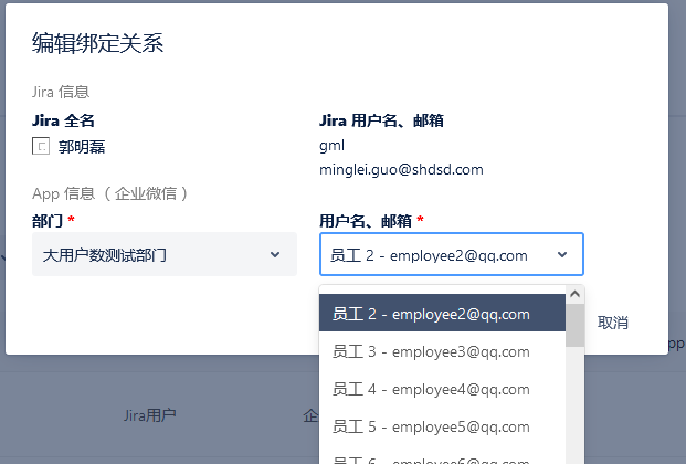 步骤3:部门和用户ID、姓名选择完,点击绑定按钮,操作成功,同时,已绑定的用户列表刷新