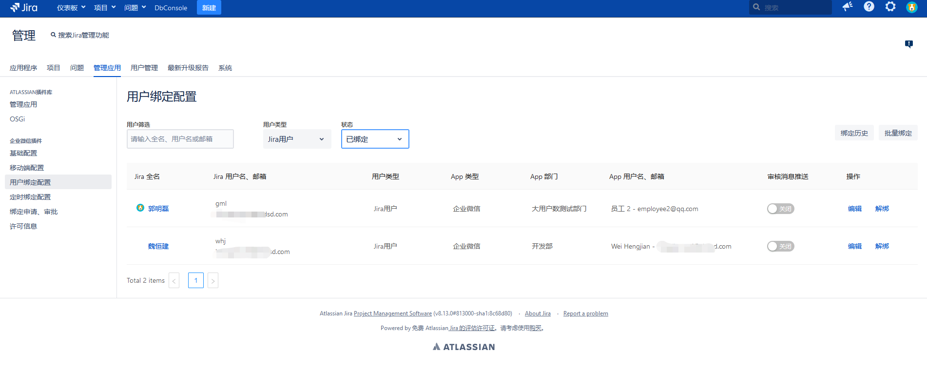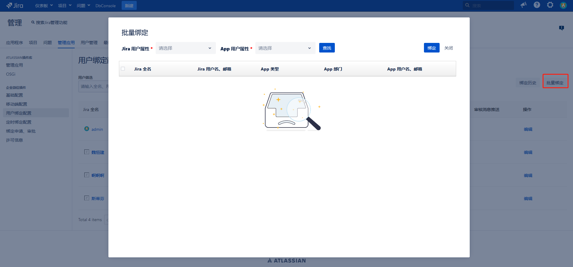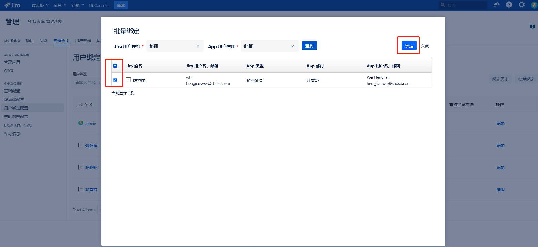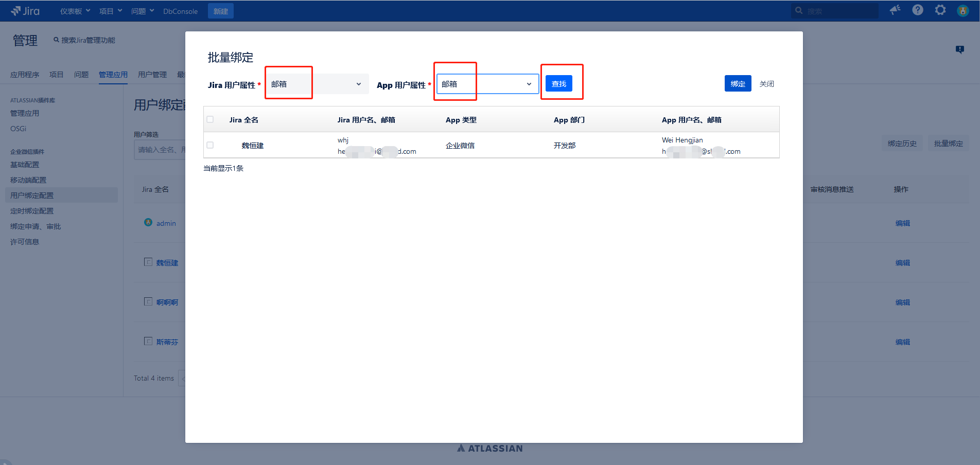 用户可根据 Jira 用户的邮箱、用户名、全名,和 App 用户ID、姓名、邮箱进行匹配查询,并对查询结果进行批量绑定。