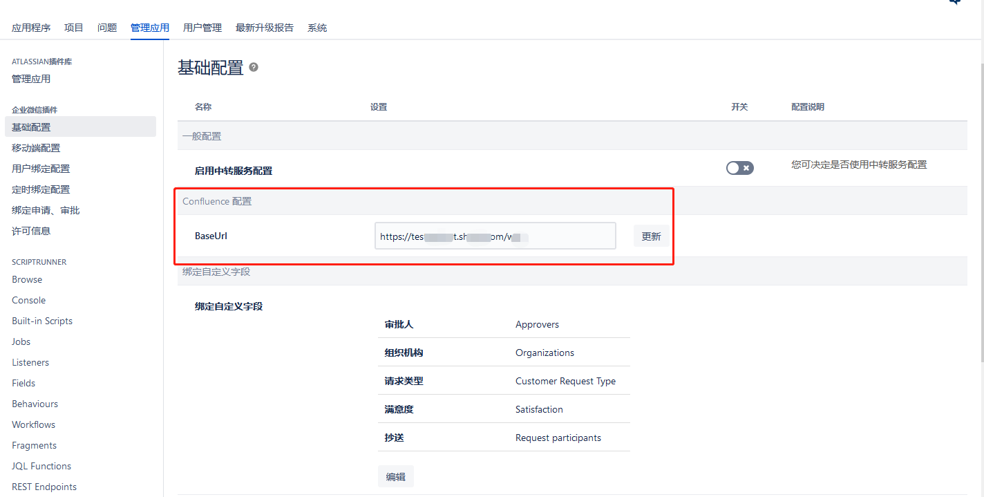 二 打开非中转模式的基础配置页面,将 Confluence 环境的 Url 输入并更新: