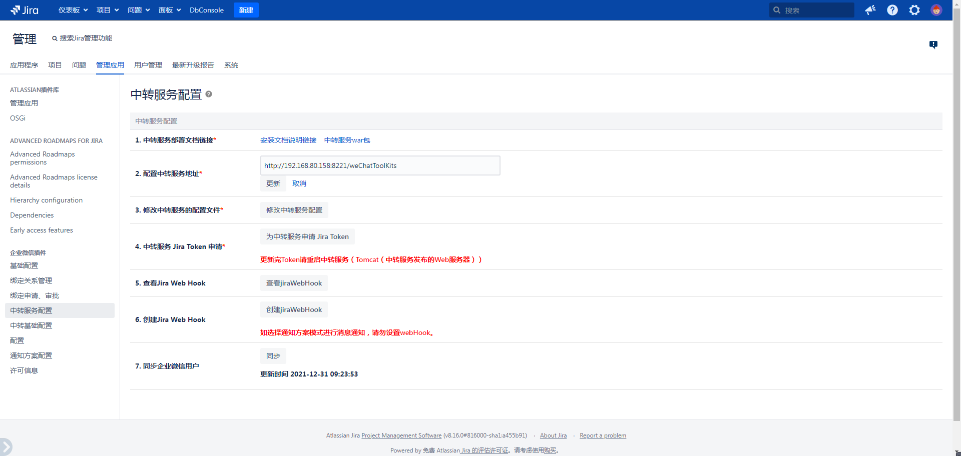 中进行相应配置,请勿创建 JiraWebHook.