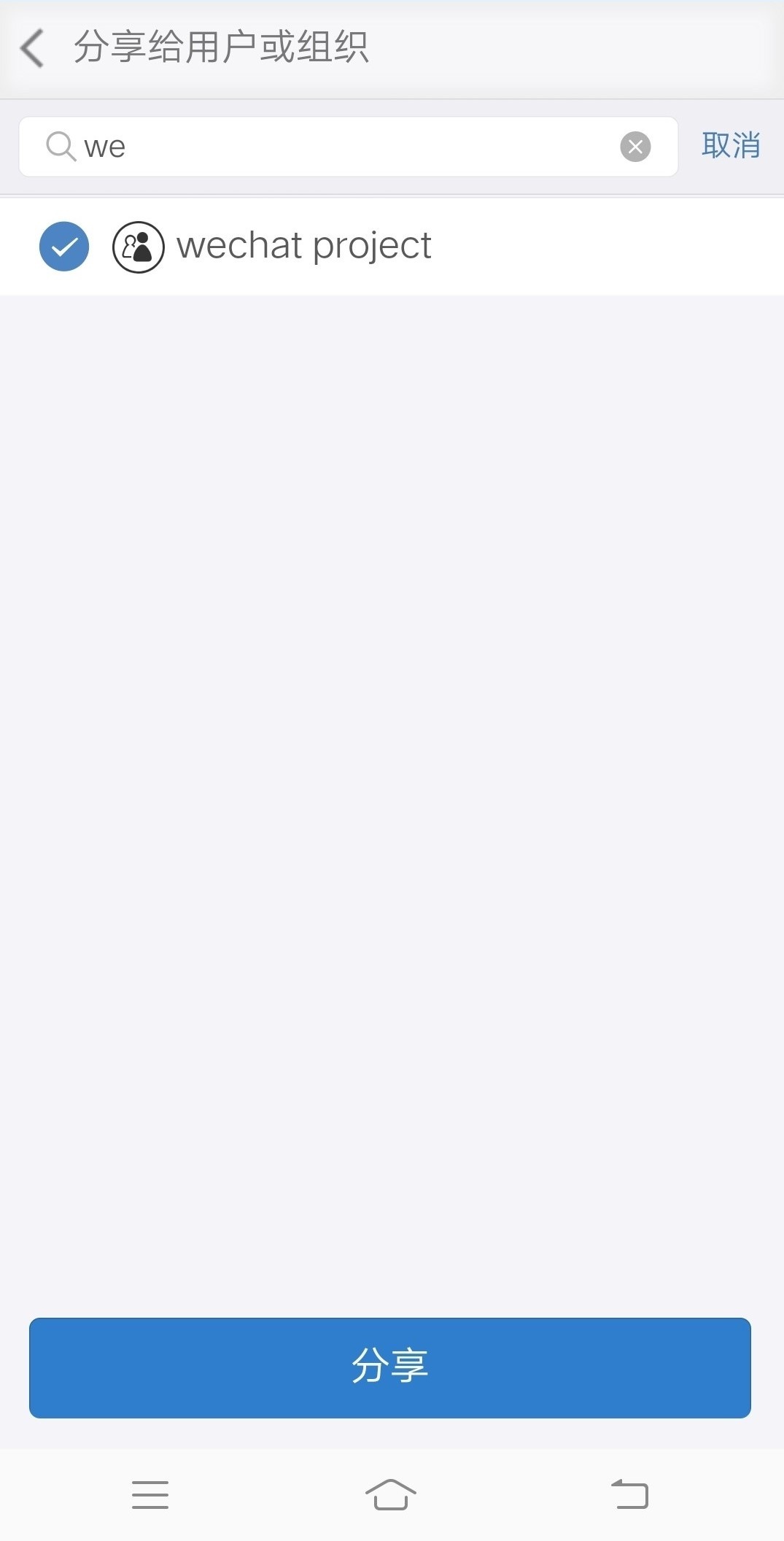点击分享,可以选择分享给用户或组织,在搜索栏输入用户或组织的名称,选择用户或组织,点击分享