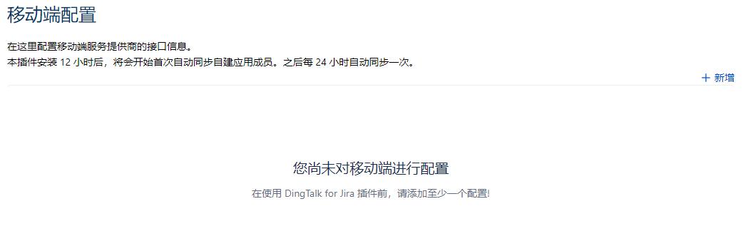 通过DingTalk for Jira 插件-【移动端配置】,点击”新增“按钮,确认类型后。键入企业ID、自建应用AgentId、自建应用AgentKey、自建应用Secret,你可以先进行连接测试,显示连接成功,点击保存后即可进行钉钉用户的同步。