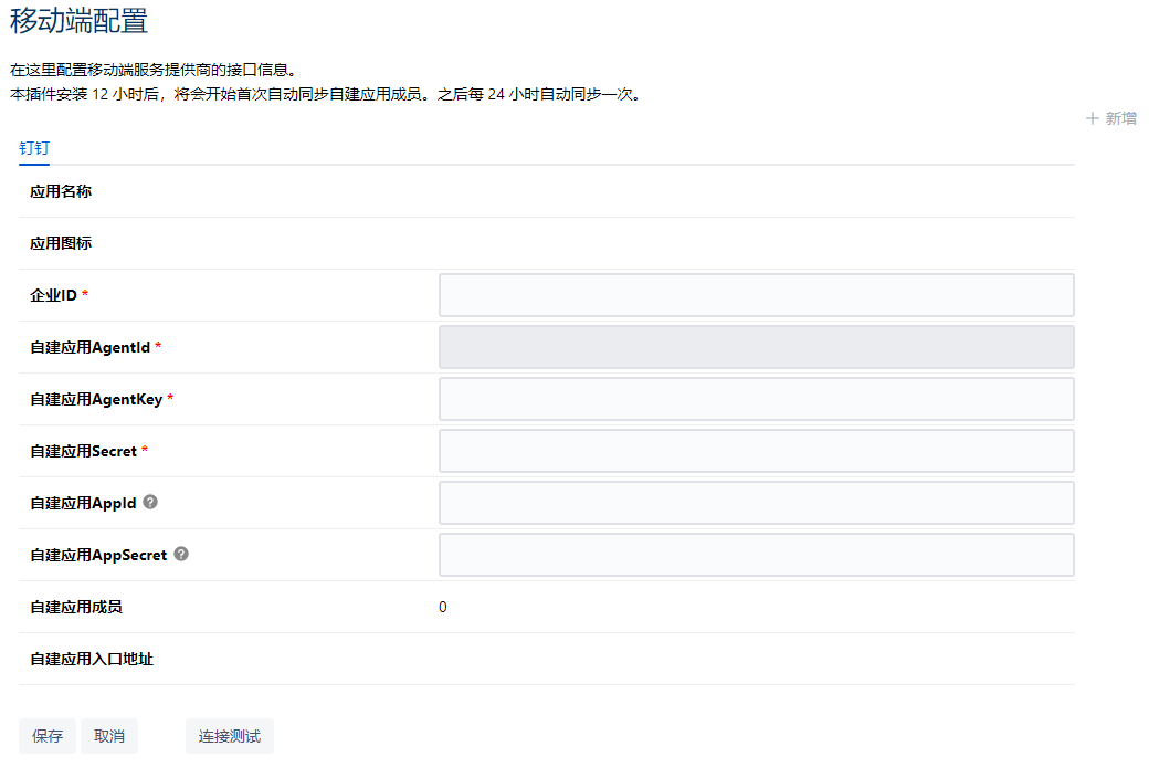 根据实际情况填写移动端的自建应用信息 (输入完毕后可以点击下方连接测试按钮,如信息无误右上角提示连接成功)。